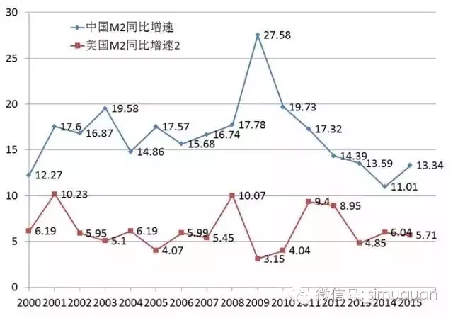 如图,我们的M2扩张数据在过去10多年间,一直远超美国!