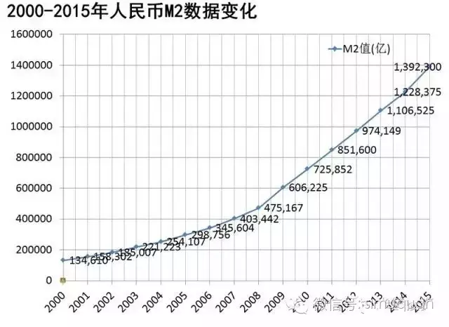可以看出,美国M2数据在过去十多年是平稳上升,没有剧烈变化,但中国的M2自2008年开始加速上升,在2009年超过美国,并继续保持高昂的姿态在上升,截止2015年底,中国的M2数值已经是美国的1.813倍!
